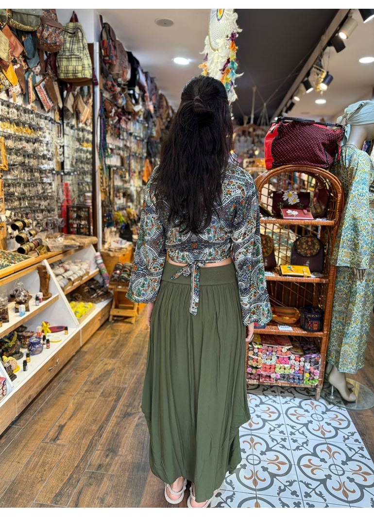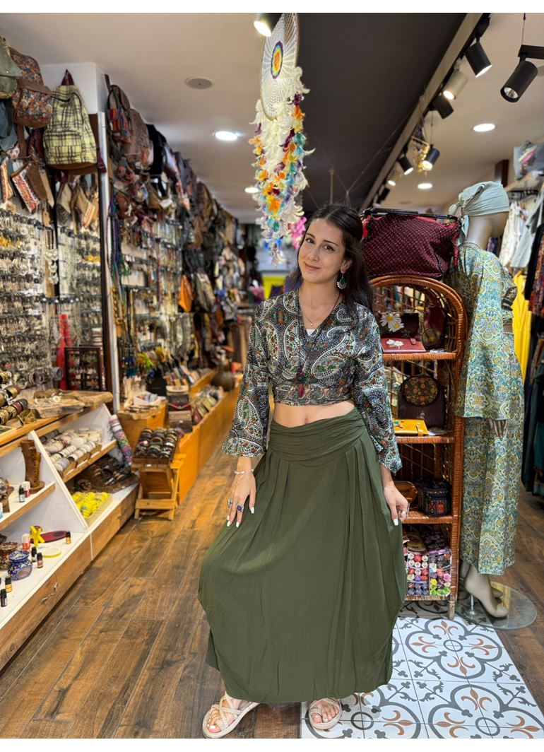 Beli Lastikli Drape Detaylı Haki Bohem Etek