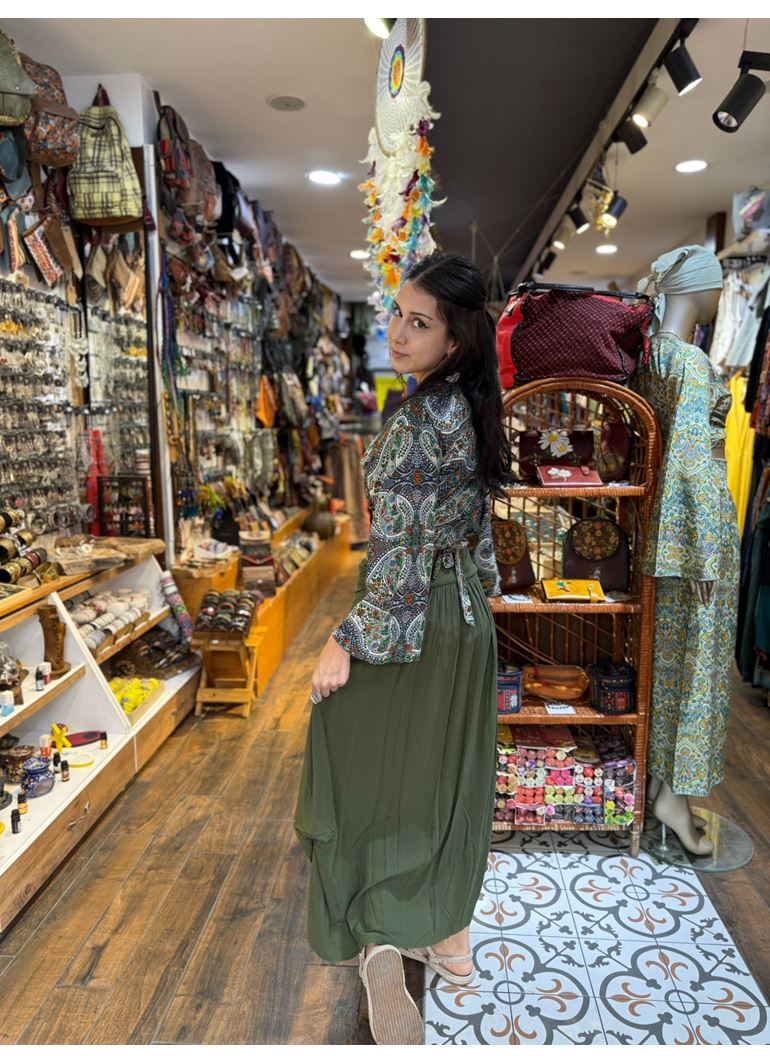 Desen: Haki tonlarında bohem desen; her kombinle uyum sağlar.