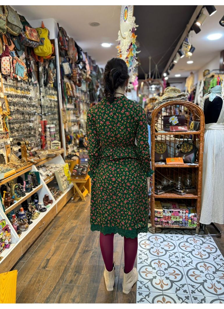 Hakim Yaka Beli Lastikli Dantelli Yeşil Çiçekli Elbise