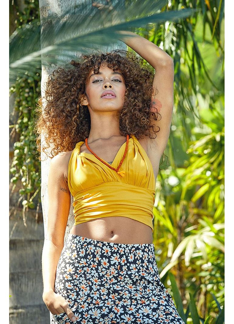 Bağlamalı Sırt Detaylı Şık Bohem Crop Bluz Sarı