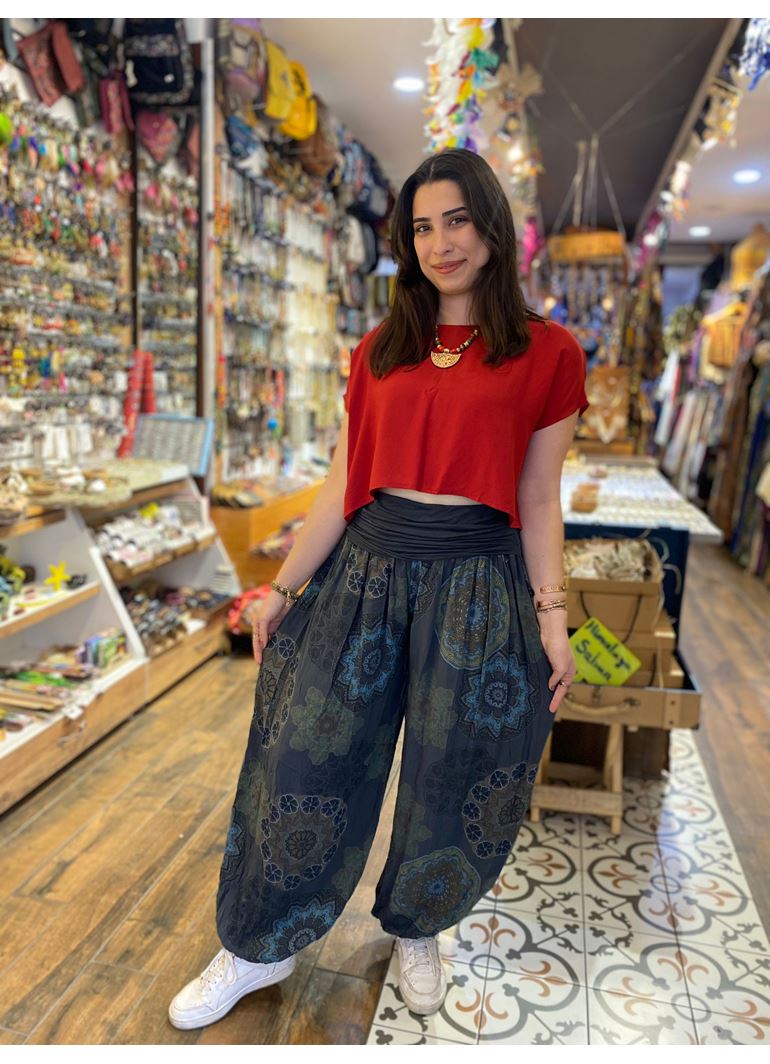 Bel detaylı paçası lastikli şalvar pantolon