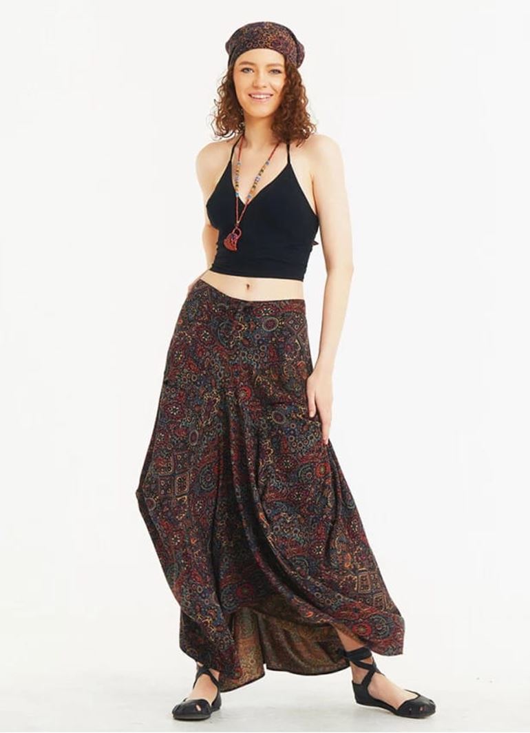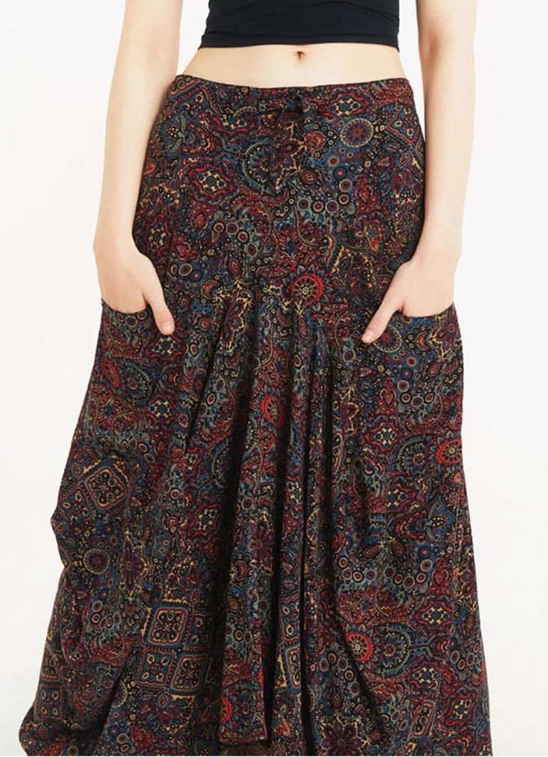 Bohem Tarz Asimetrik Kesim Cepli Uzun Desenli Etek
