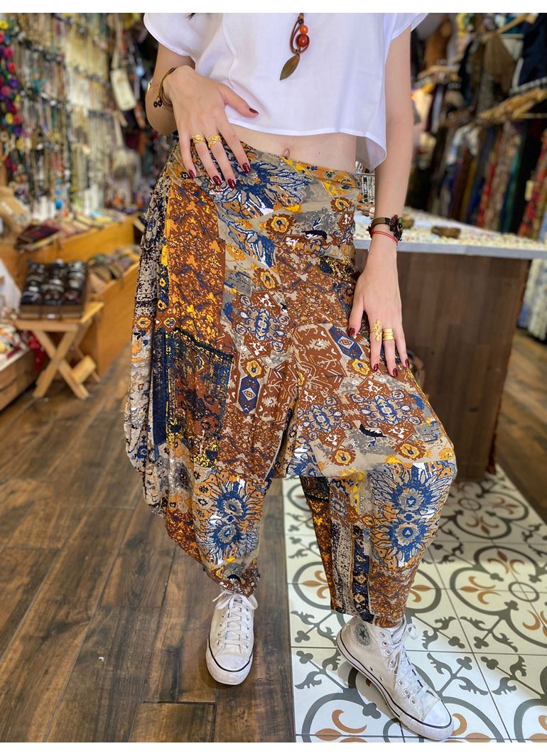Drape Bel Dökümlü Kadın Gri Desenli Şalvar Pantolon