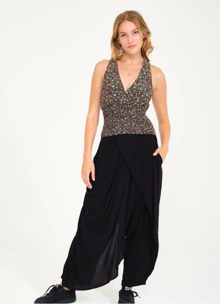 %100 dokuma viskon. Kayın ağacından elde edilmiş doğal selülozdan dokunmuş kumaştandır. Çok hafif ve dökümlüdür. Polyester içermez, sizi terletmez. Çamaşır makinasında 30 derecede yıkayabilirsiniz.