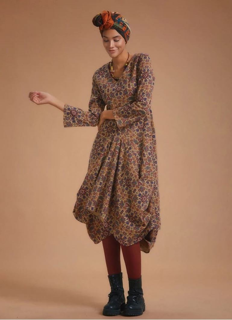 Şık, V Yaka, Balon Etek Detaylı, Karat Desenli Elbise