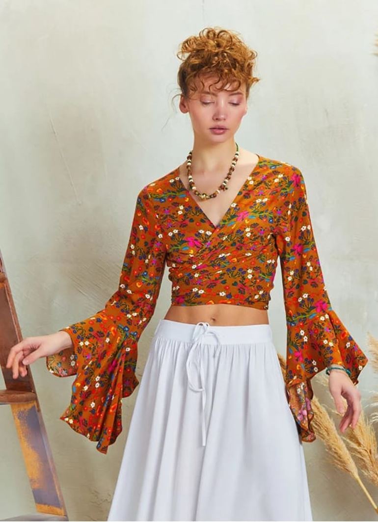 Volanlı Kol Ucu Detaylı, Bağlamalı, Kruvaze Yaka, Uzun Kollu Crop Bluz