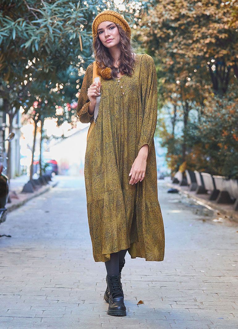 V Yaka Kol Ucu Lastikli Bohem Salaş Hardal Desenli Elbise