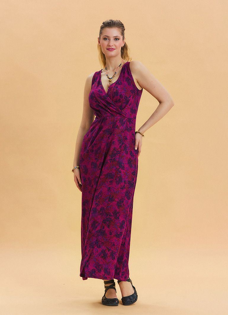 V Yaka Yırtmaç Detaylı Desenli Şarabi Uzun Elbise